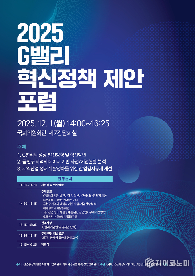 지이코노미 최영규 기자 | 금천구(구청장 유성훈)는 G밸리의 미래 발전 방향과 혁신전략을 논의하기 위한 ‘G밸리 혁신정책 제안 포럼’이 12월 1일 국회의원회관 제7간담회실에서 개최된다고 밝혔다.