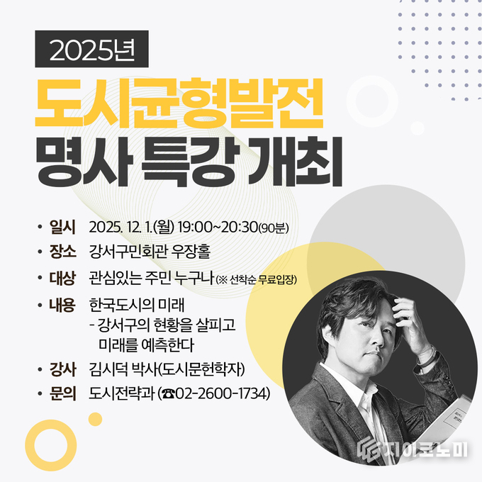 이번 특강은 12월 1일(월) 오후 7시부터 8시 30분까지 강서구민회관(우장산로 66) 우장홀에서 열린다. 관심 있는 주민 누구나 선착순으로 무료 참여할 수 있다.