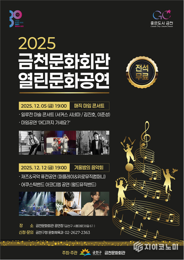 지이코노미 최영규 기자 | 금천구(구청장 유성훈)는 오는 12월 5일과 12월 12일 오후 7시, 두 차례에 걸쳐 금천문화회관에서 기획공연 ‘2025 금천문화회관 열린문화공연’을 개최한다고 밝혔다.