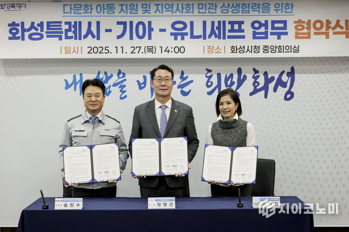 지이코노미 최영규 기자 | 화성특례시(시장 정명근)가 27일 시청 중앙회의실에서 유니세프 한국위원회, 기아 주식회사와 ‘다문화아동 지원 및 지역사회 민관 상생 협력을 위한 업무협약’을 체결했다.