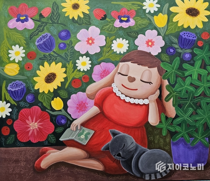 꽃으로 가득한 정원은 감정 회복의 공간을 의미하고, 인물이 들고 있는 책은 마음의 숨을 고르는 시간의 상징이에요. 옆에서 자고 있는 고양이는 예전에 키우던 반려묘인데, 떠난 뒤에도 제게는 정서적 안정감을 주는 존재여서 작품에 자연스럽게 녹아들었어요.
