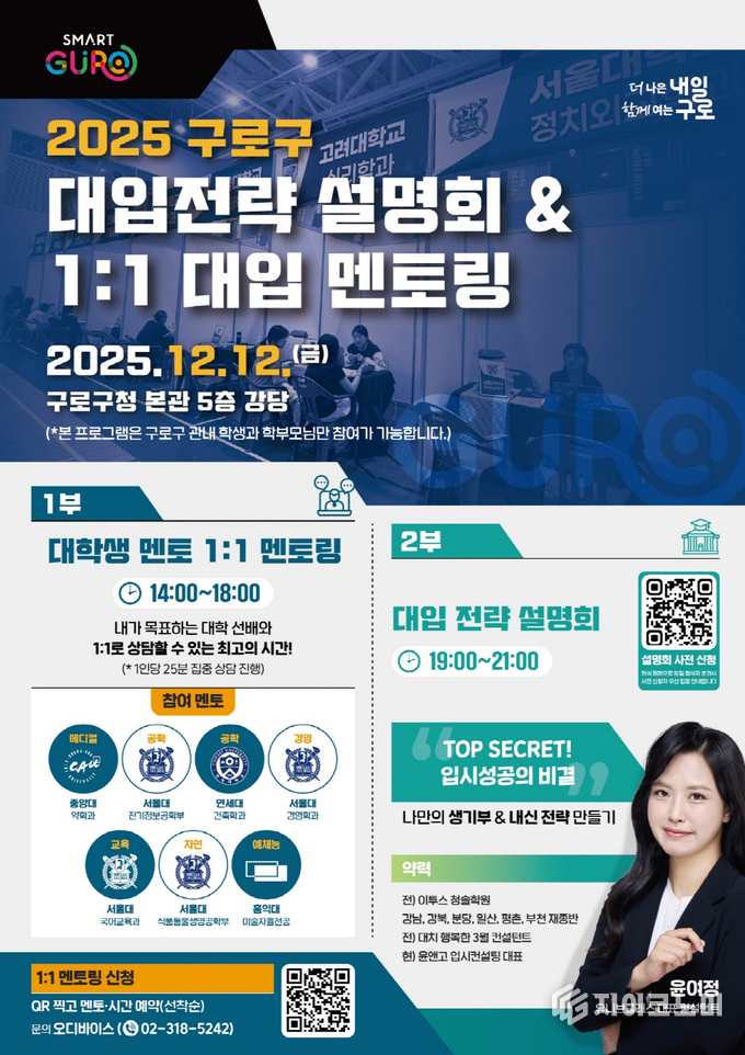 지이코노미 최영규 기자 | 구로구(구청장 장인홍)는 이달 12일 구청 강당에서 대입을 준비하는 예비 수험생들을 위해 대입 전략 설명회와 일대일 상담(멘토링)을 운영한다.