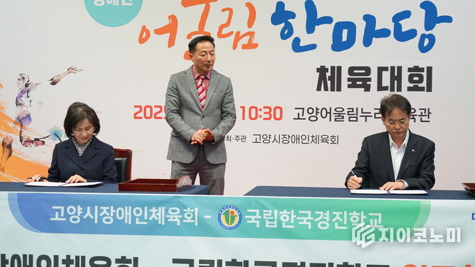 이날 개회식 순서로는 고양시장애인체육회와 한국국립경진학교가 장애학생 체육활동 기회 확대를 위한 업무협약을 체결했다.
