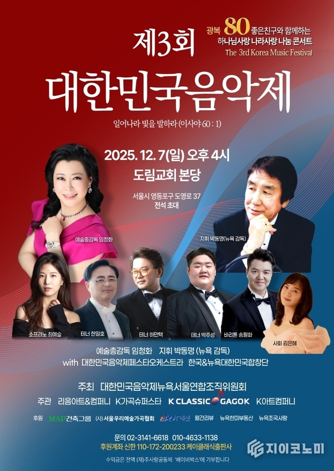 지이코노미 이성용 기자 | 2025년 12월 7일, 서울 도림교회에서 한·미 양국이 공동으로 주관한 ‘제3회 대한민국 음악제’가 천여 명의 청중이 모인 가운데 성황리에 개최됐다. 이번 음악제는 “음악이 한 사회의 기억과 영혼을 깨우는 힘”을 생생히 증명하며, 전통적 음악 공연의 경계를 넘어선 신앙·문화 축제로 자리매김했다.