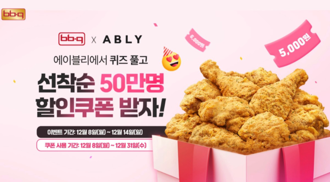 BBQ는 지난 9월 뿜치킹 출시를 기념해 에이블리와 진행한 1차 협업에 대한 높은 호응을 기반으로 에이블리와 다시 한번 앵콜 프로모션을 마련했다. 프로모션 기간 동안 에이블리 앱 내 BBQ 이벤트 페이지에서 뿜치킹 관련 퀴즈를 맞힌 선착순 50만 명에게는 5,000원·6,000원 할인 쿠폰 또는 뿜치킹 한 마리 증정 쿠폰 중 하나가 랜덤으로 제공된다.
