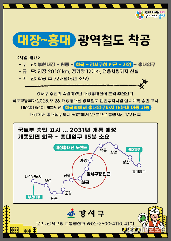 지이코노미 최영규 기자 | 서울 강서구(구청장 진교훈)의 숙원 사업이자 서남권 교통 체계를 획기적으로 바꿀 광역철도 사업인 ‘대장홍대선’이 12월 15일 공식 착공한다.