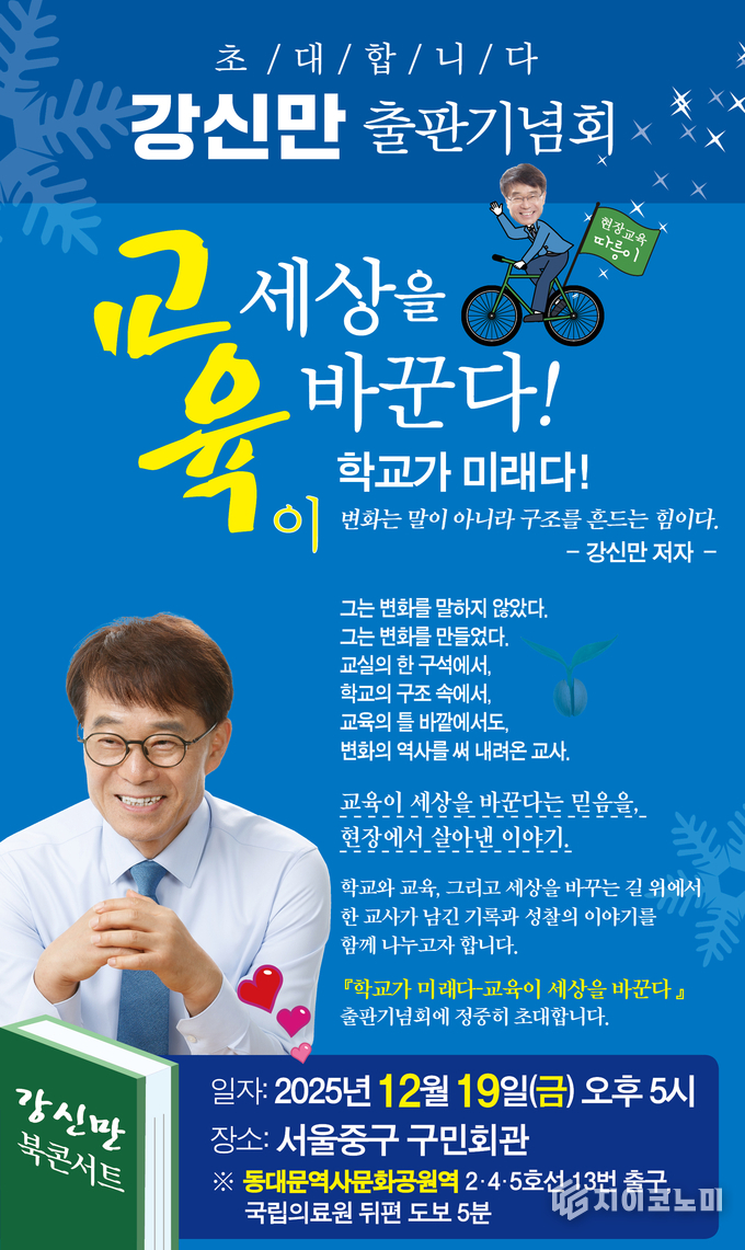지이코노미 정길종 기자 |31년간 교단을 지키며 교육 현장의 변화를 이끌어온 강신만 교사가 신간 ‘교육이 세상을 바꾼다’ 출간을 기념해 시민들과 만난다. 출판기념회는 오는 12월 19일 오후 5시, 서울 중구 구민회관 2층 대강당에서 열린다.
