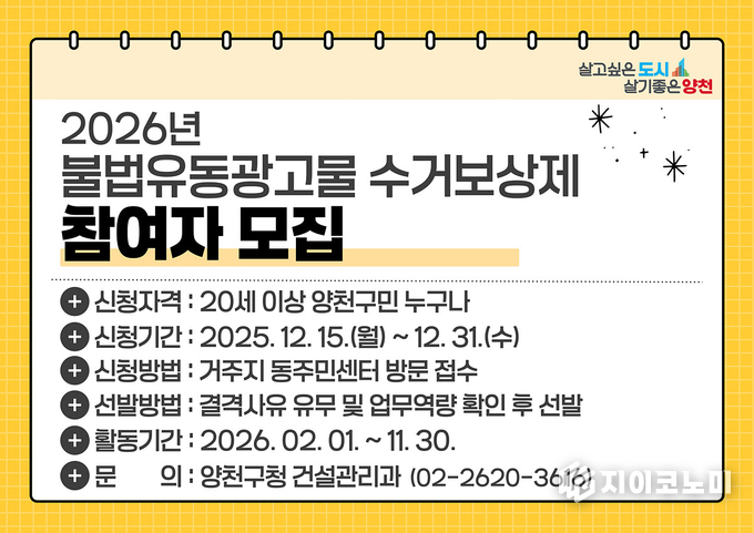 지이코노미 최영규 기자 | 양천구(구청장 이기재)는 도시 미관을 해치고 보행 안전을 위협하는 불법 현수막·전단 등을 집중 정비하기 위해 ‘2026년 불법유동광고물 수거보상제’를 운영하고, 오는 31일까지 참여자를 모집한다고 14일 밝혔다.