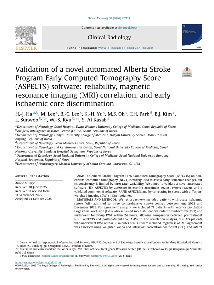 지이코노미 양하영 기자 | 의료 인공지능(AI) 기업 제이엘케이(322510, 대표 김동민)가 자체 개발한 뇌졸중 CT 자동 분석 기술이 뇌졸중 진단의 난제인 “초급성기 병변” 탐지 능력을 입증하며 국제 학술지 Clinical Radiology에 게재되었다고 15일 밝혔다.
