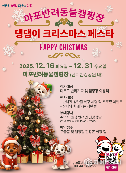지이코노미 최영규 기자 | 마포구(구청장 박강수)는 연말을 맞아 2025년 12월 16일부터 12월 31일까지 난지한강공원 내 마포반려동물캠핑장에서 반려동물과 특별한 연말 추억을 만들 수 있는 ‘댕댕이 크리스마스 페스타’를 개최한다.