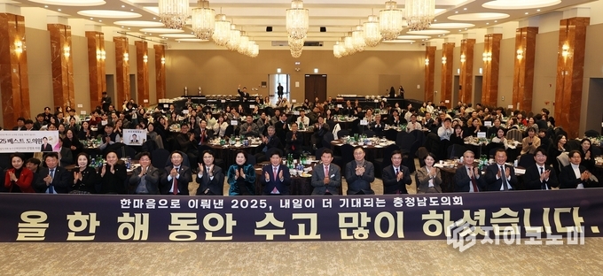 지이코노미 정길종 기자 |충남도의회(의장 홍성현)는 15일 예산 스플라스 리솜 그랜드홀에서 도의원과 사무처 직원, 도지사, 교육감 등 220여 명이 참석한 가운데 ‘2025년 한마음 송년 워크숍’을 개최했다.