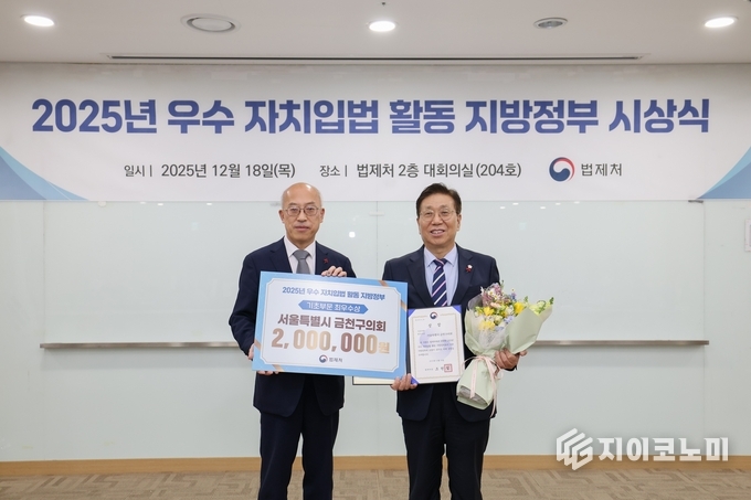 지이코노미 최영규 기자 | 금천구의회(의장 이인식)가 법제처 주관 ‘2025년 우수 자치입법 활동 지방정부 선정’기초부문에서 최우수상을 수상했다.