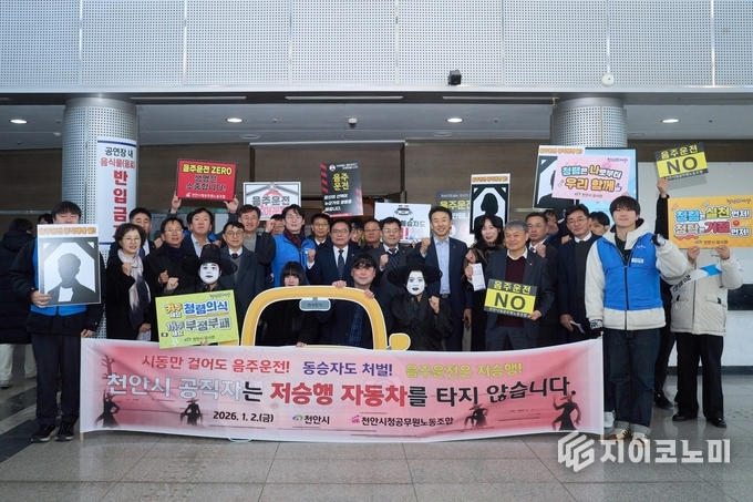 지이코노미 정길종 기자 |천안시청공무원노동조합과 천안시는 2026년 1월 2일 오전, 새해 시무식이 열린 천안시청 봉서홀 로비에서 전 직원을 대상으로 ‘음주운전 근절 캠페인’을 공동으로 실시했다.