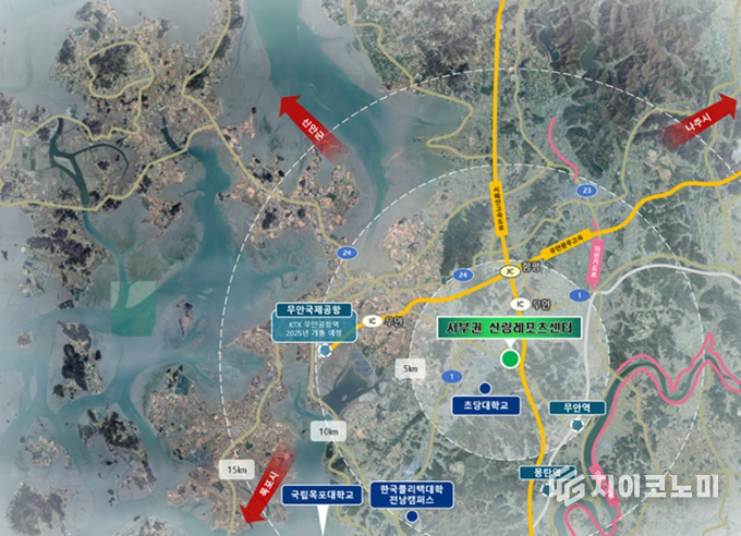 무안읍 일원 2만㎡ 부지에 2026년부터 2029년까지 총 300억 원을 투입해 짚라인, 산악자전거, 로프체험, 트리탑 등 다양한 산림레포츠 시설을 조성한다.