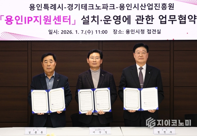 지이코노미 최영규 기자 | 용인특례시(시장 이상일)는 7일 시청 접견실에서 경기테크노파크, 용인시산업진흥원과 '용인IP지원센터 운영에 관한 상호협력 협약'을 체결했다.
