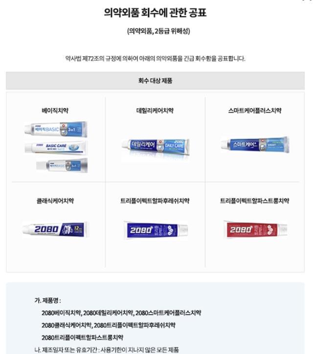 앞서 애경산업은 지난 6일 ‘2080 베이직치약’, ‘2080 데일리케어치약’, ‘2080 스마트케어플러스치약’, ‘2080 클래식케어치약’, ‘2080 트리플이펙트 알파 후레쉬치약’, ‘2080 트리플이펙트 알파 스트롱치약’ 등 6종에 대해 리콜을 진행했다. 이들 제품은 중국 도미(Domy)가 제조하고 애경산업이 수입·판매한 치약이다.