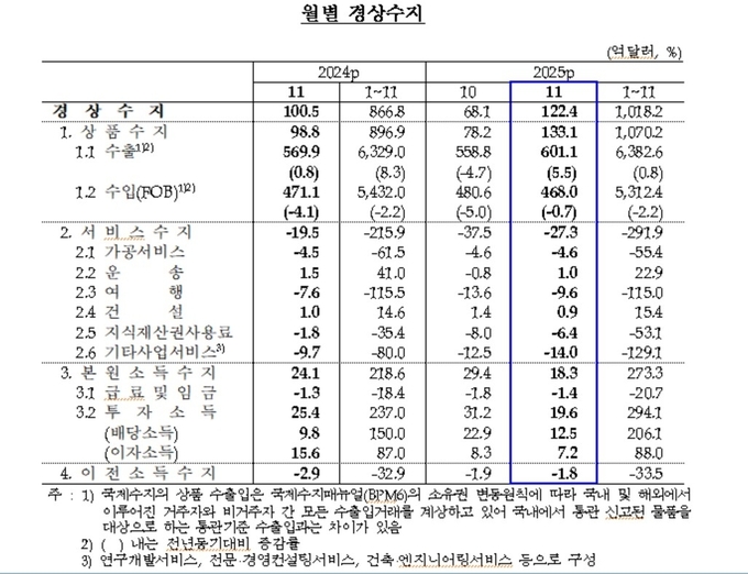 한국은행이 9일 발표한 국제수지 잠정 통계에 따르면 작년 11월 경상수지는 122억4,000만달러(약 17조8,000억 원) 흑자로 집계됐다.