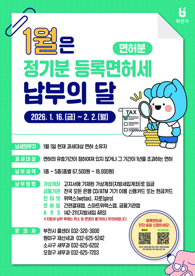 지이코노미 이창희 기자 | 부천시가 2026년 1월 정기분 등록면허세(면허분) 9만 1000건, 30억 원을 부과했다고 12일 밝혔다.