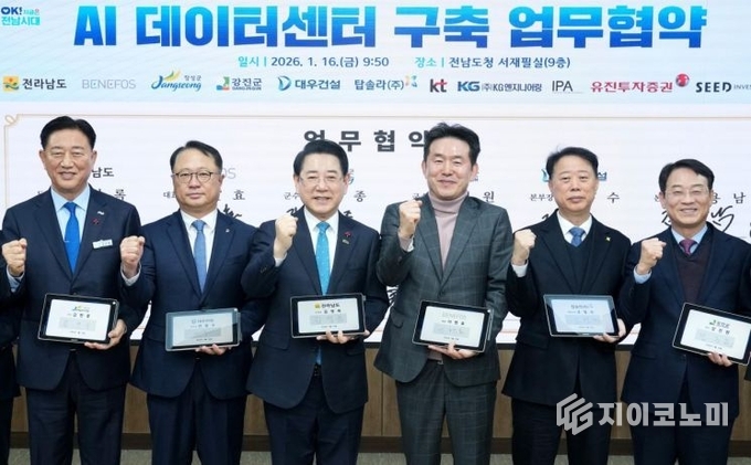 전라남도는 지난 16일 장성군·강진군과 민간 참여 기관이 함께 ‘AI 데이터센터 구축을 위한 업무협약’을 체결했다고 밝혔다. 협약에는 전남도와 장성군, 강진군을 비롯해 베네포스, 대우건설, KT, 탑솔라, KG엔지니어링, IPA, 유진투자증권, 시드인베스트먼트 자산운용 등이 참여했다.
