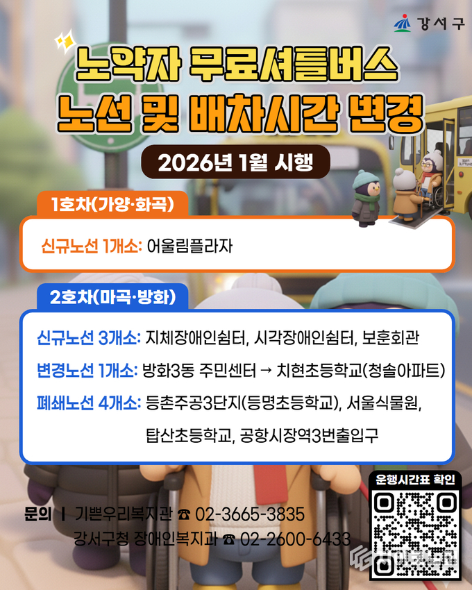 지이코노미 최영규 기자 | 서울 강서구(구청장 진교훈)는 장애인과 어르신 등 교통약자의 이동 편의를 높이기 위해 ‘노약자 무료셔틀버스’ 노선을 정비하고, 변경 운행에 들어갔다고 밝혔다.