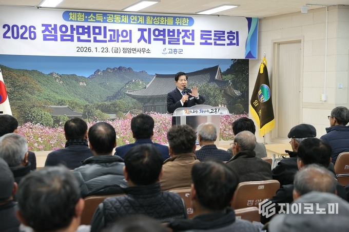 ▲23일 점암면 군민과의 대화에서 공영민 고흥군수가 ‘편가르기 없는 고흥’을 강조하며 군민 통합과 지역 변화·발전의 기틀을 언급하는 인사말을 하고 있다. G이코노미 DB