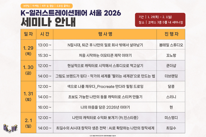 콘텐츠 구성 역시 산업 전반을 아우르는 방향으로 확장됐다. 전시 기간에 운영되는 세미나 프로그램은 일러스트레이션 산업 종사자들이 현장에서 체감하는 이야기를 중심으로 구성됐다. 브랜딩과 마케팅, 외주와 협업 구조, AI 활용법 등 실무적인 주제부터 드로잉 클래스를 포함한 참여형 프로그램까지 폭넓은 스펙트럼을 제시한다. 세미나는 입장권을 소지한 관람객이라면 누구나 무료로 수강할 수 있으며, 상세 일정은 공식 홈페이지를 통해 확인할 수 있다.