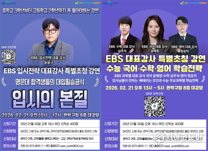 지이코노미 최영규 기자 | 관악구(구청장 박준희)가 오는 2월 21일 관악구청 대강당에서 개최하는 ‘2027학년도 대입·학습전략 특강’을 개최, 고등학생과 예비 수험생, 학부모의 입시 걱정 해소에 나선다.