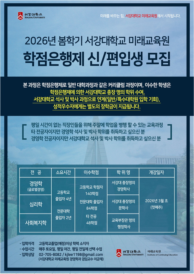 2026학년도 봄학기 신·편입학 모집 요강과 세부 커리큘럼은 서강대학교 미래교육원 공식 홈페이지를 통해 확인할 수 있다.