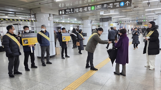 지이코노미 이창희 기자 | 서울교통공사(이하 공사)가 한국승강기안전공단(이하 공단)과 함께 설 연휴를 앞두고 지난 10일 2·4호선 사당역에서 '에스컬레이터 안전 이용 합동 캠페인'을 실시했다고 밝혔다.