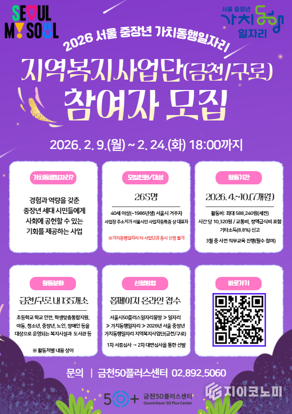 지이코노미 최영규 기자 | 금천구(구청장 유성훈)는 금천50플러스센터(센터장 김미성)에서 경험과 역량을 갖춘 중장년 세대들에게 지속적인 사회참여를 지원하기 위해 ‘2026년 서울 중장년 가치동행일자리사업’ 참여자를 모집한다고 밝혔다.