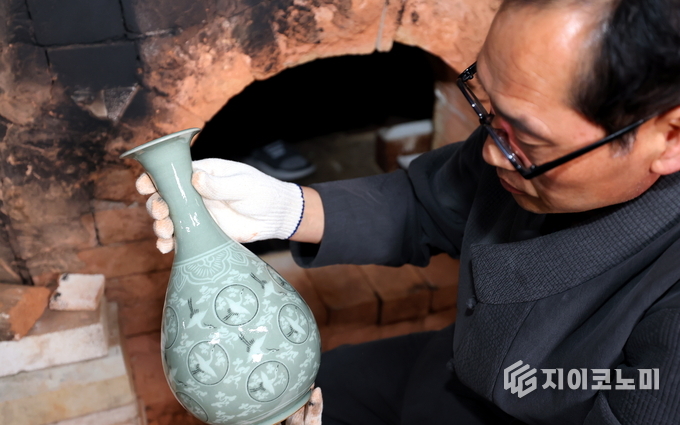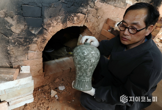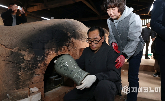 가마문이 열리자 은은한 비색을 띤 청자가 모습을 드러내며 현장의 열기를 더했다. (강진군 제공)