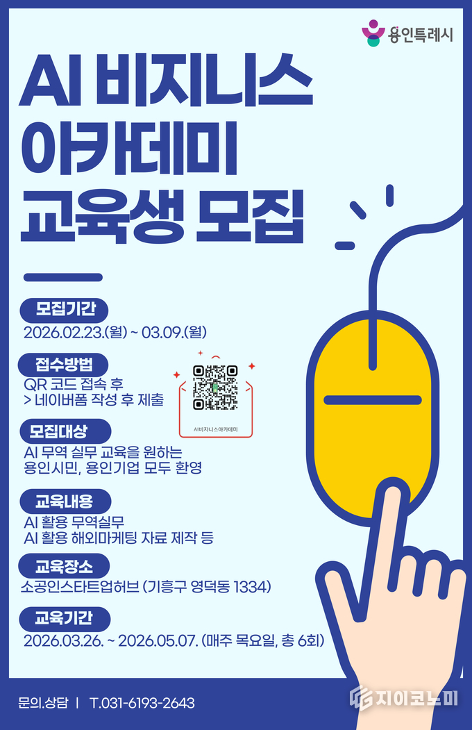 지이코노미 최영규 기자 | 용인특례시(시장 이상일)는 ‘2026년 인공지능(AI) 수출패키지 지원사업’과 ‘AI 비지니스 아카데미’ 참가자를 모집한다고 23일 밝혔다.