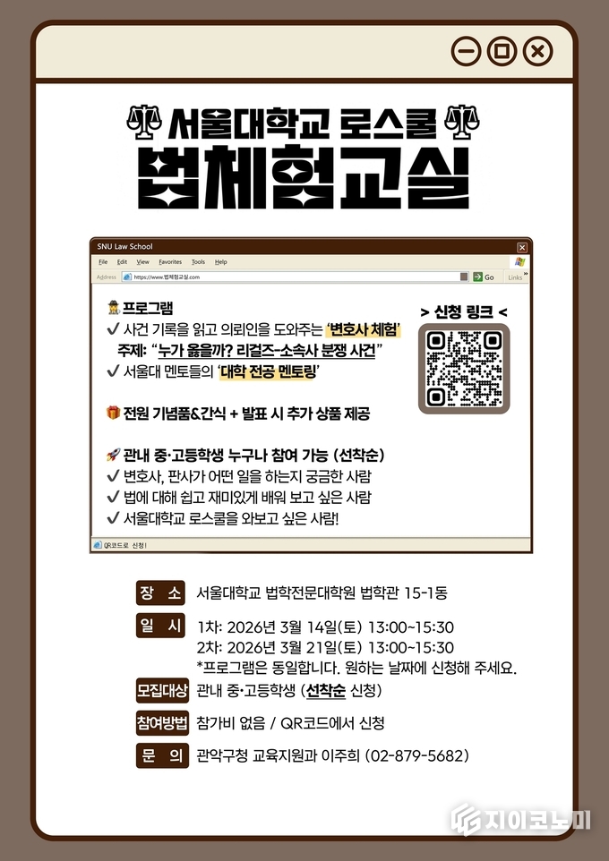 이번 법체험 교실은 3월 14일과 21일 두 차례 서울대학교 법학전문대학원에서 운영된다. 참여를 희망하는 관내 중‧고등학생은 오는 3월 3일부터 10일까지 홍보 포스터의 QR코드를 통해 개별 신청하면 된다.