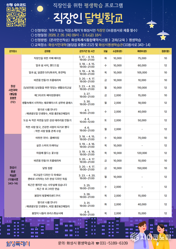 지이코노미 최영규 기자 | 화성특례시(시장 정명근)는 2월 26일부터 3월 6일까지 직장인 달빛학교 1차 수강생을 선착순으로 모집한다고 밝혔다.