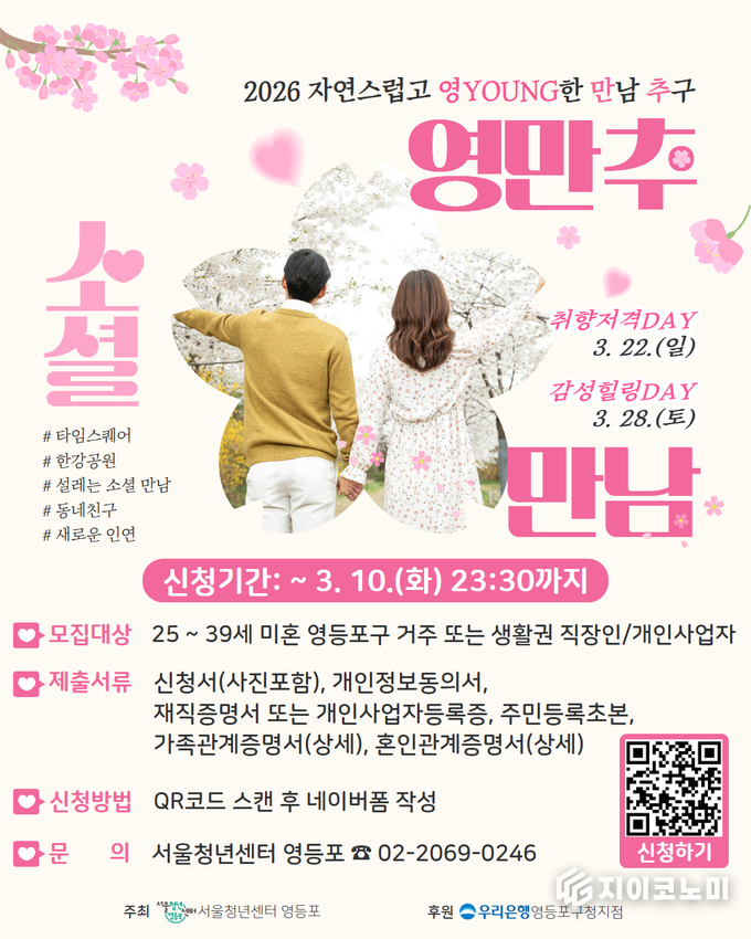 참여를 희망하는 청년은 3월 10일까지 홍보 포스터 속 정보무늬(QR코드)를 통해 신청서와 증빙서류를 제출하면 된다. 자세한 사항은 구청 누리집 ‘우리구소식’ 게시판 또는 서울청년센터 영등포로 문의하면 된다.