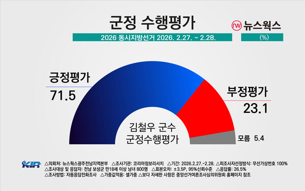군정 수행에 대한 평가는 더 높았다. 긍정 응답이 71.5%로 집계됐다. ‘매우 잘함’ 41.7%, ‘잘하는 편’ 29.8%다. 부정 평가는 23.1%였다. ‘매우 잘함’이 40%를 넘긴 점은 단단한 지지 기반을 보여주는 대목이다. 선거를 앞둔 시점, 현직 프리미엄이 수치로 확인됐다는 분석이 나온다.