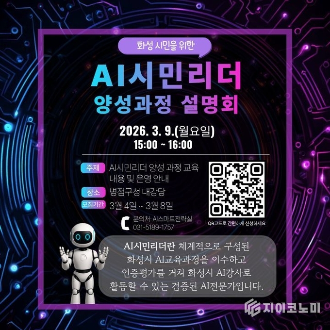 이번 설명회에서는 ‘AI시민리더’ 양성 과정의 운영 체계와 교육 내용, 참여 방법을 안내한다. 아울러 강사 인증 절차와 활동 지원 계획에 대한 상세 설명과 질의응답도 진행될 예정이다. 참여자 모집 기간은 3월 4일부터 8일까지며, 문의는 화성특례시 AI스마트전략실로 하면 된다.