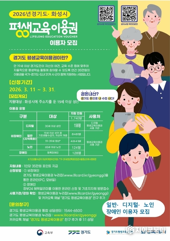 지이코노미 최영규 기자 | 화성특례시(시장 정명근)는 평생학습 소외계층의 학습권을 보장하고 교육격차를 완화하기 위해 ‘2026년 평생교육이용권 지원사업’ 이용자 1차 모집을 오는 3월 11일부터 31일까지 실시한다고 밝혔다.