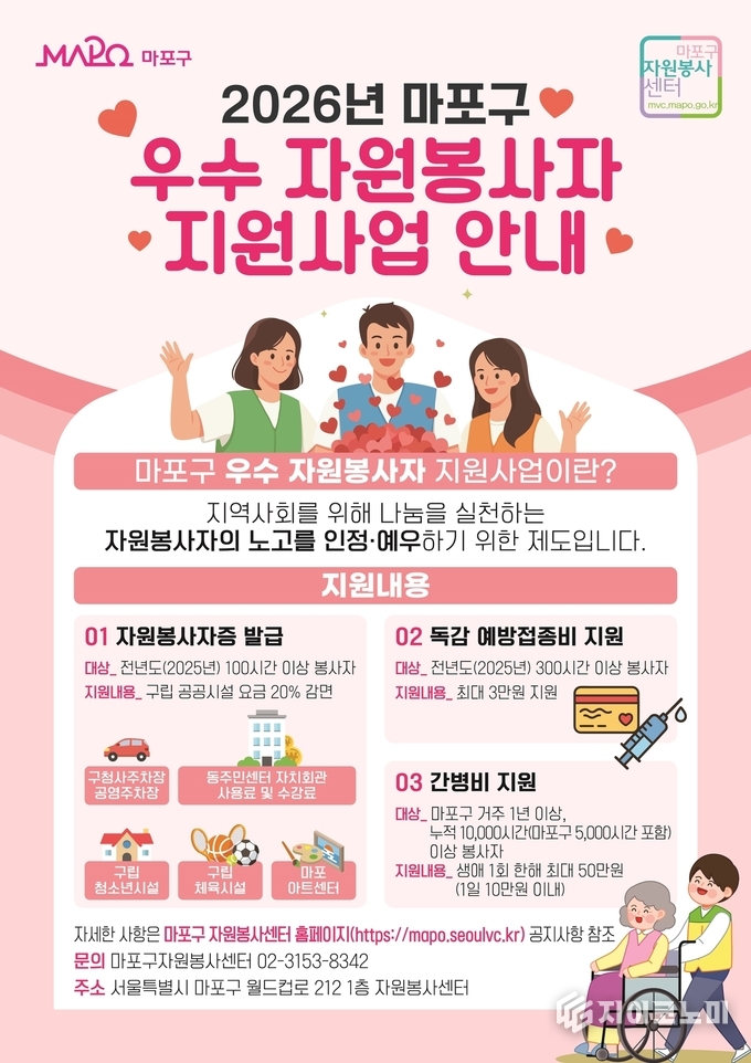 지이코노미 최영규 기자 | 마포구(구청장 박강수)가 자원봉사자의 노고와 헌신에 보답하고 자원봉사 참여 문화를 확산하기 위해 올해부터 우수 자원봉사자를 대상으로 ‘인플루엔자 예방접종비’와 ‘간병비’를 새롭게 지원한다.