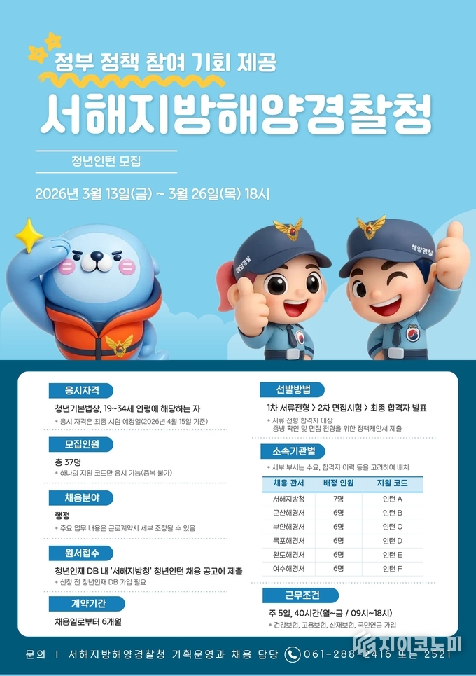 지이코노미 김정훈 기자 | 서해지방해양경찰청(청장 백학선)은 청년들에게 공직 경험 기회를 제공하기 위해 ‘2026년 청년인턴’ 채용을 진행한다고 12일 밝혔다.