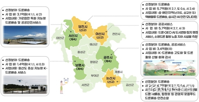 이와 함께 지난해에 이어 선정된 공주·보령·서산시는 드론 배송과 재난 감시 등 기존 실증사업을 고도화하며 운영 범위를 확대한다.