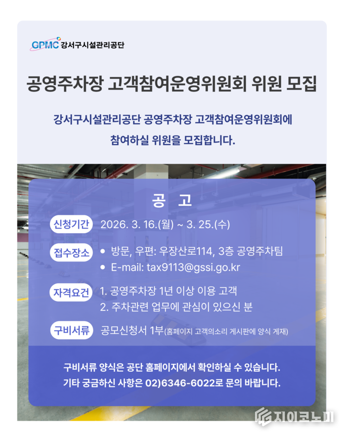 지이코노미 최영규 기자 | 강서구시설관리공단(이사장 김용연)은 공영주차장 운영에 대한 이용자 의견을 적극 반영하고 주민 참여 기반의 운영을 강화하기 위해 ‘공영주차장 고객참여운영위원회’ 위원을 공개 모집한다고 밝혔다.
