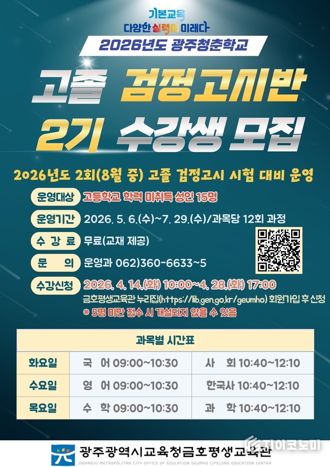 금호평생교육관은 오는 5월부터 7월까지 성인 만학도와 시니어를 대상으로 ‘고졸 검정고시반’ 2기를 운영한다고 밝혔다. 이번 과정은 ‘광주청춘학교’ 사업의 일환으로, 학업의 기회를 놓친 성인들에게 교육 기회를 제공하고 학력 취득과 제2의 인생 설계를 지원하기 위해 마련됐다.
