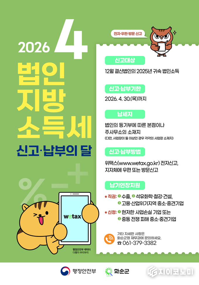 화순군은 2025년 12월 말 결산법인을 대상으로 4월 30일까지 법인지방소득세 신고·납부를 받는다고 밝혔다.