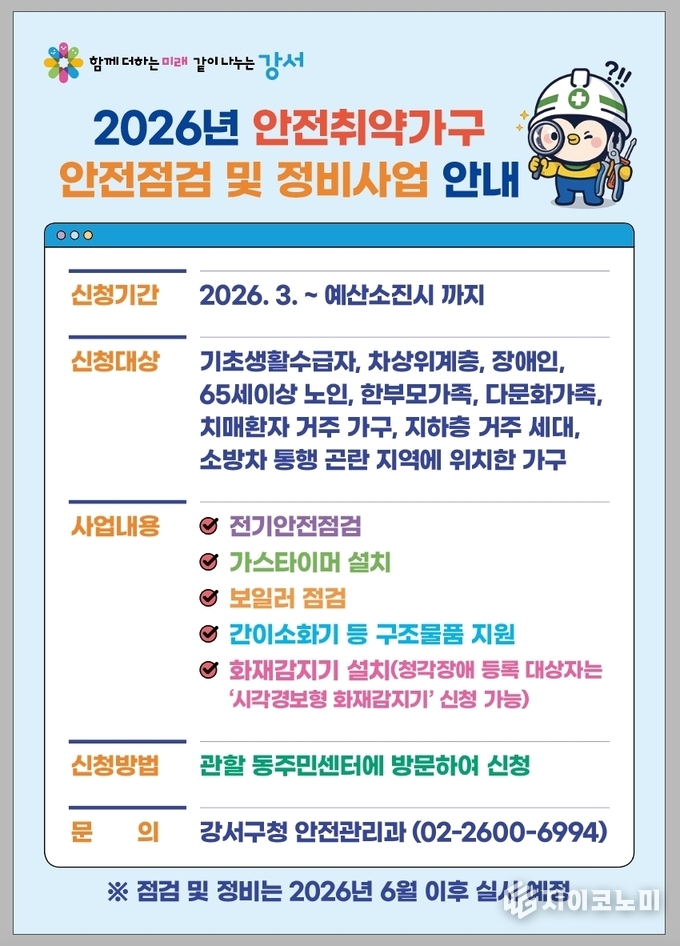 구 관계자는 “작은 결함이 자칫 큰 사고로 이어질 수 있는 만큼, 생활 속 위험 요소를 선제적으로 예방하는 것이 무엇보다 중요하다”며, “앞으로도 안전 사각지대를 최소화하고 취약계층을 위한 지원을 강화해 구민 모두가 안심하고 살 수 있는 안전한 강서구를 만들겠다”고 밝혔다.