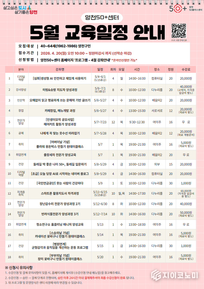 양천50플러스센터 5월 강좌 수강생 모집기간은 4월 20일 오전 10시부터 정원 마감 시까지이며, 중장년을 대상으로 모집하되 양천구 거주자와 만 40~64세에게 우선 선발 기회가 제공된다. 자세한 교육 일정과 신청은 양천50플러스센터 홈페이지에서 확인할 수 있다.