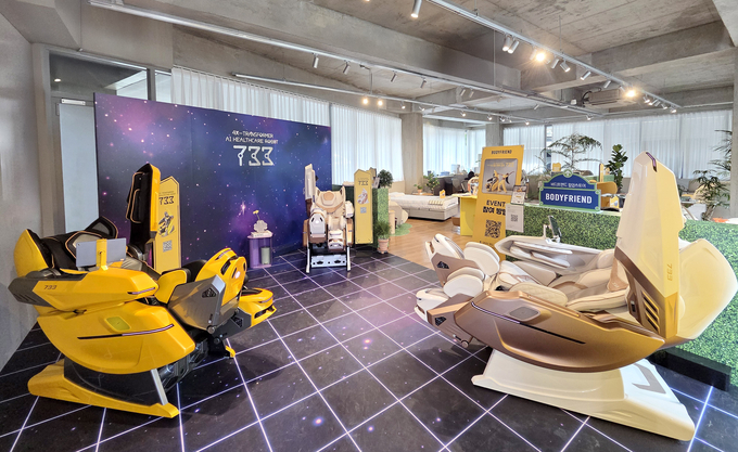 체험 공간에는 지난달 출시된 웨어러블 AI헬스케어로봇 ‘733’을 비롯해 퀀텀AI, 의료기기 메디컬파라오와 메디컬팬텀로봇, 콤팩트 헬스케어로봇 팔콘S, 마사지소파 파밀레S·파밀레C, 라클라우드 헬스모션, W정수기 등이 배치됐다.