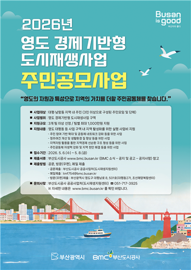 지이코노미 정태율 기자 | 부산도시공사(사장 신창호)는 부산시와 주민주도 도시재생 활성화 기반 구축을 위한 ‘영도 경제기반형 도시재생사업 주민공모사업’을 본격 추진한다고 밝혔다.