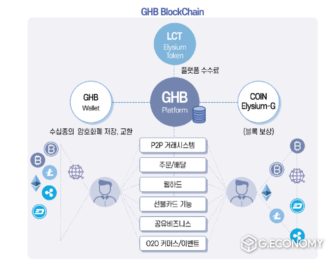 GHB는 실제 물품을 구매하는 데 현금처럼 암호화폐를 사용할 수 있도록 블록체인 플랫폼을 구축한 회사이다. 블록체인 기술을 기반으로 유저(소비자)가 광고를 시청하고 나면 그 보상으로 애드 포인트를 채굴할 수 있고, 포인트를 엘리시움G(Elysium-G) 코인으로 교환하여 상품을 구매하는 데 사용할 수 있다.