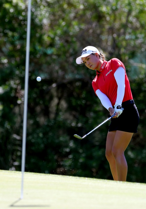 이민지가 3번 홀 그린엣지에서 칩샷을 하고 있다
